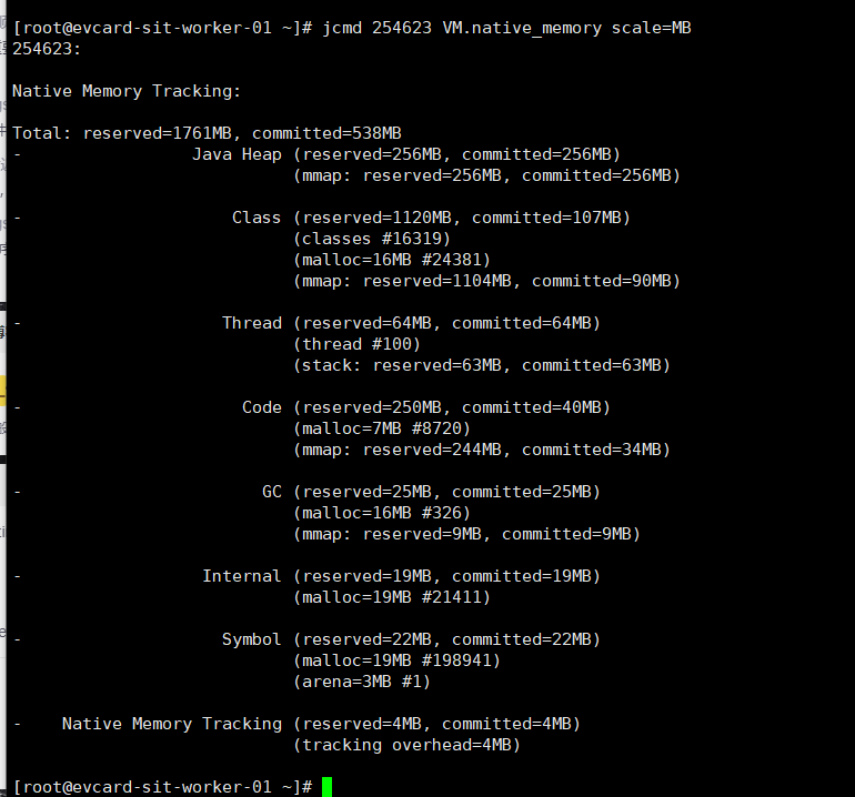 然后就是用 Jcmd 命令查看了非堆内存占用的具体大小。发现是不到300M。