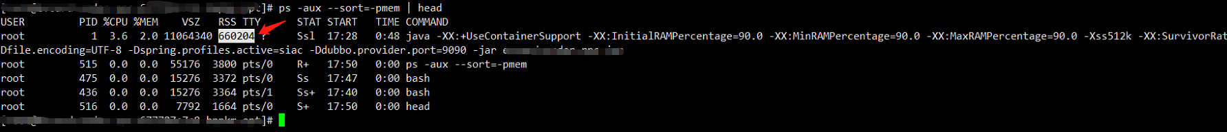 之前在虚拟机上,设置的 -Xmx 也是 512M。 这说明还有别的东西在吃内存。直到运维给我发了这张图,看到这个命令,我就去以前的机器上执行了相同的命令,占用内存也比设置的 -Xmx, 在700M左右。这说明我没重视的非堆内存,占用了200M+的内存空间。 这比我想象的要多很多。